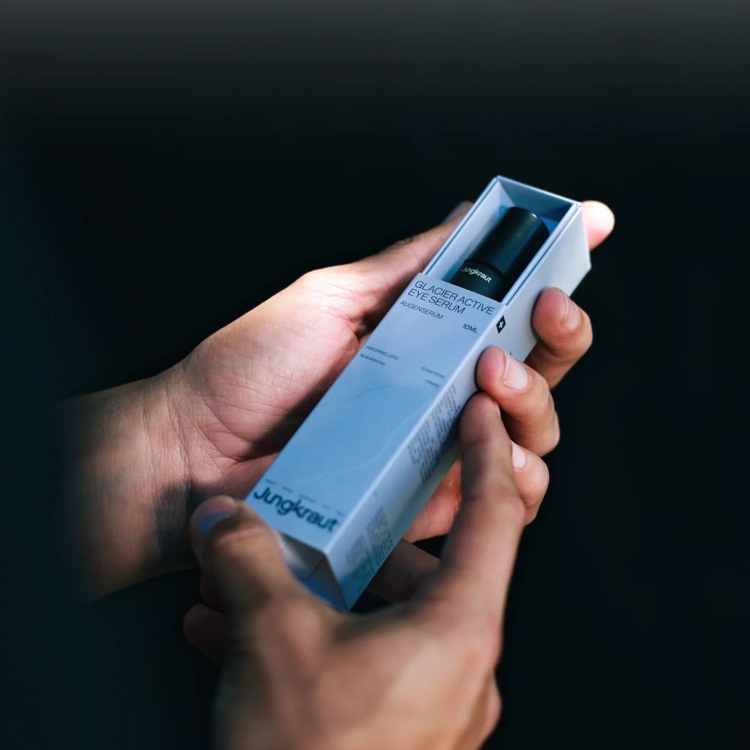 On average, the natural eye serum for men lasts around 6 months. However, this depends on your skincare routine and skin. Most customers use the eye serum 1-2 times a day, moving the roller several times under the eyes from the inside to the outside. The Glacier Active Eye Serum is very rich and highly concentrated. It is easy to dispense with the roll-on. A very small amount per care application is completely sufficient.