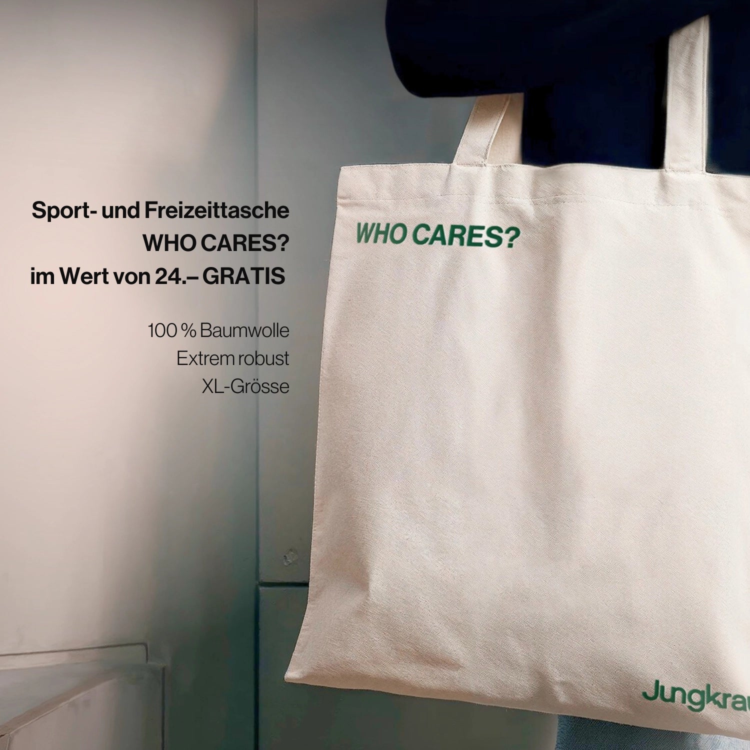 Robust sports and beach bag made of recycled cotton (36 × 41 cm) with extra-long handles – practical, stylish, and durable. Your everyday companion in a limited-edition design. Individually priced at CHF 24 (free in the set). Oeko-Tex® 100 certified.